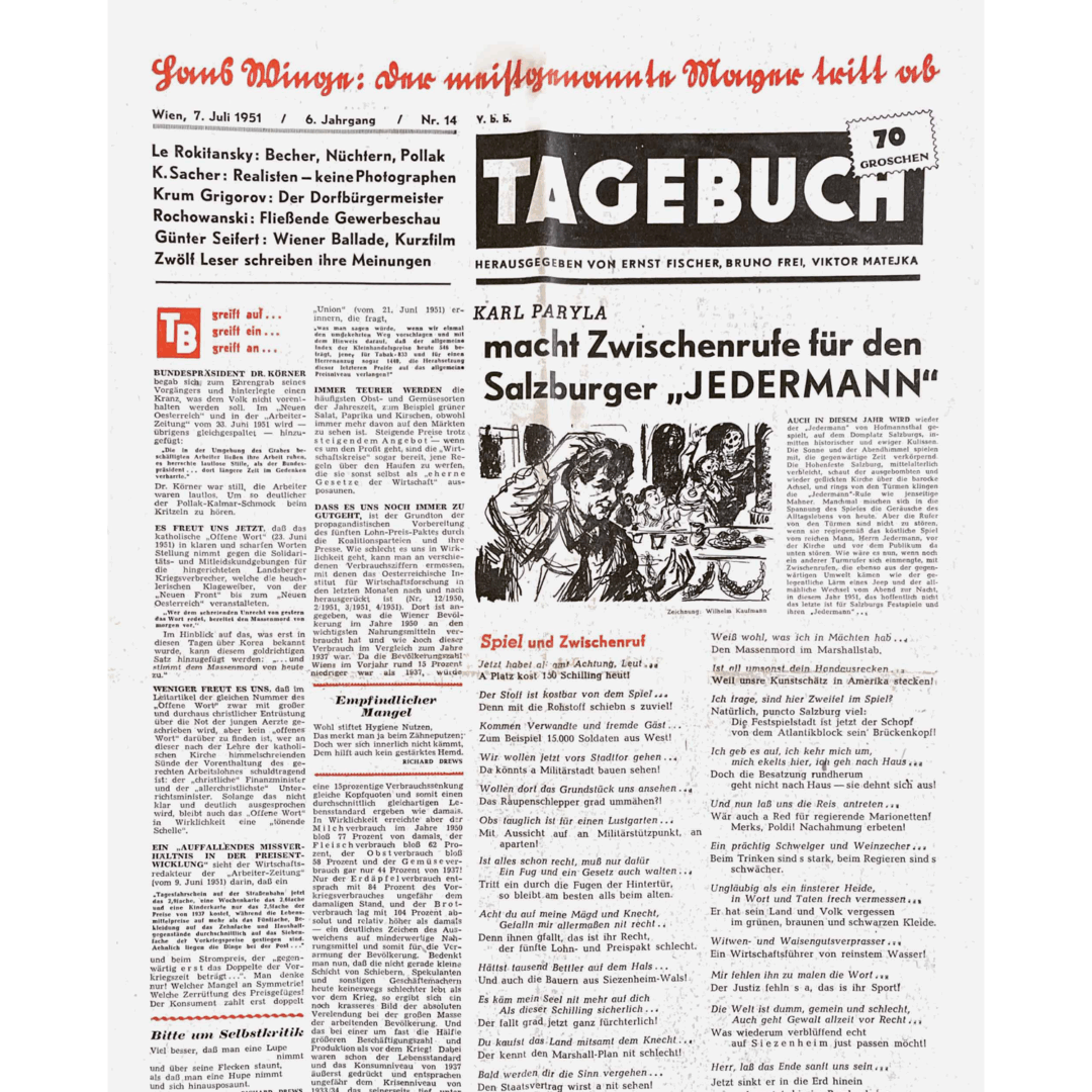 Paryla war 1948, nach seiner Rückkehr aus dem Schweizer Exil, der KPÖ beigetreten und hatte im selben Jahr das Neue Theater in der Scala mitbegründet, das 1956 den politischen Sanktionen und Schikanen zum Opfer fallen sollte. Aber davon war noch keine Rede, als er im Sommer 1951 Verse aus dem Jedermann mit Anspielungen auf Kanzler Figl, Marshall-Plan, Koreakrieg und Nato ergänzte.