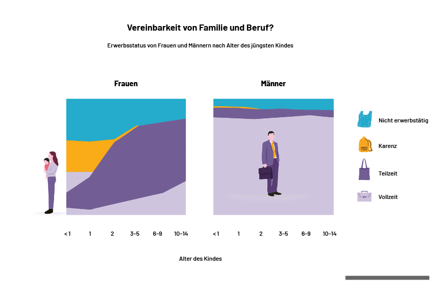 Knapp 80 Prozent der 1,4 Millionen Teilzeitarbeitenden sind Frauen. Sie leisten den Großteil der unbezahlten Sorgearbeit, die in offiziellen Statistiken oft unsichtbar bleibt. Besonders drastisch zeigt sich das in der Kinderbetreuung. Mütter erledigen die Sorgearbeit zunächst in der Karenz und später neben ihrer Teilzeitbeschäftigung. Die Erwerbstätigkeit von Vätern bleibt von der Geburt des eigenen Kindes hingegen völlig unberührt. Ob Säugling, Kleinkind oder Schulkind: Papa arbeitet Vollzeit. Nur ein Prozent aller Väter geht länger als sechs Monate in Karenz, die Vollzeitquote der Väter liegt durchwegs bei 85 Prozent. Bei Frauen schnappt die Teilzeitfalle zu, denn die dadurch erlittenen Einkommensnachteile ziehen sich bis ins Pensionsalter.