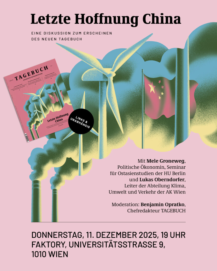 Das TAGEBUCH lädt zur Diskussion dieser Fragen mit Merle Groneweg, Autorin der Coverstory im aktuellen TAGEBUCH und Expertin für Chinas Klima- und Umweltpolitik, und Lukas Oberndorfer, Leiter der Abteilung Klima, Umwelt und Verkehr in der Arbeiterkammer Wien. Moderiert wird der Abend von TAGEBUCH-Chefredakteur Benjamin Opratko.